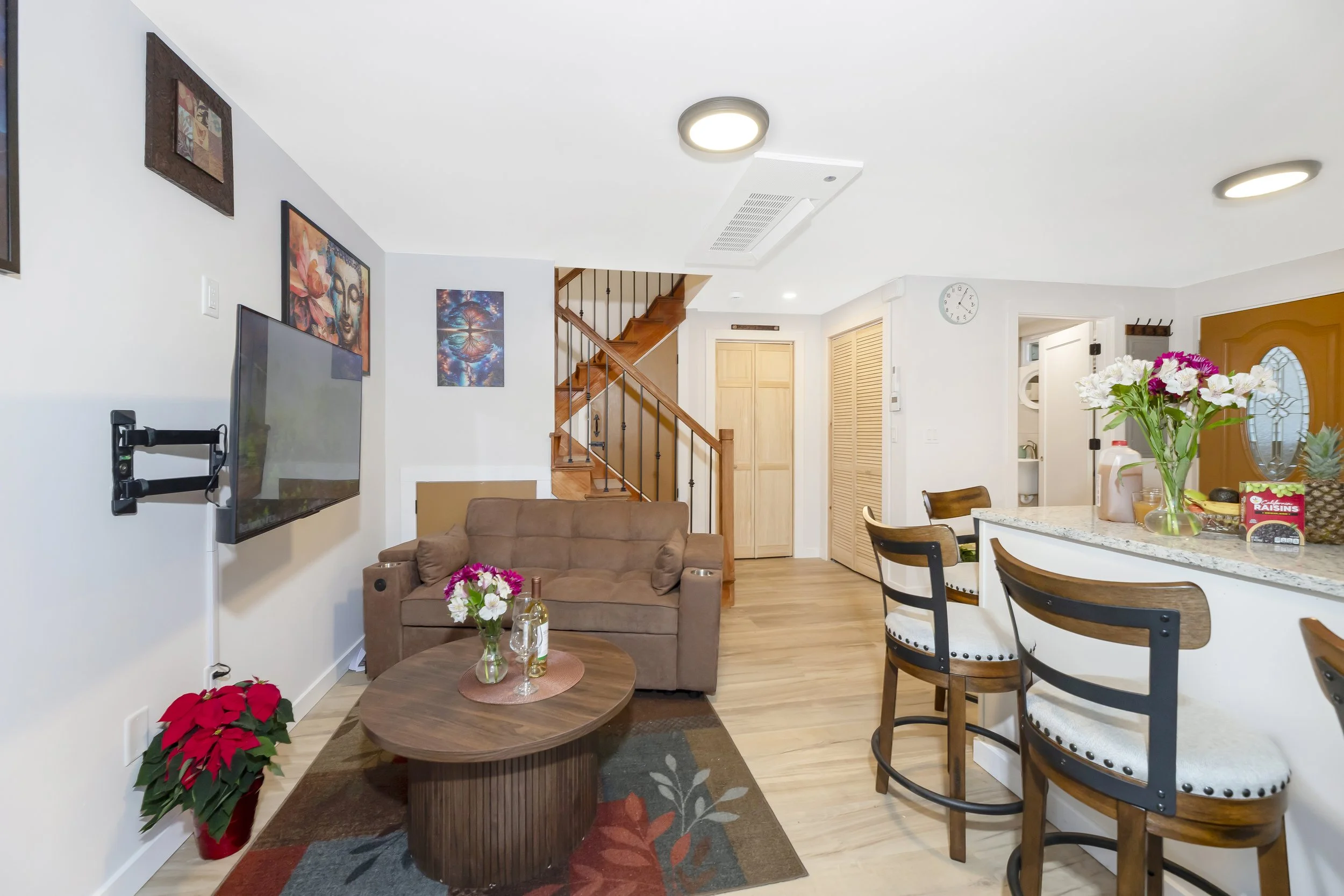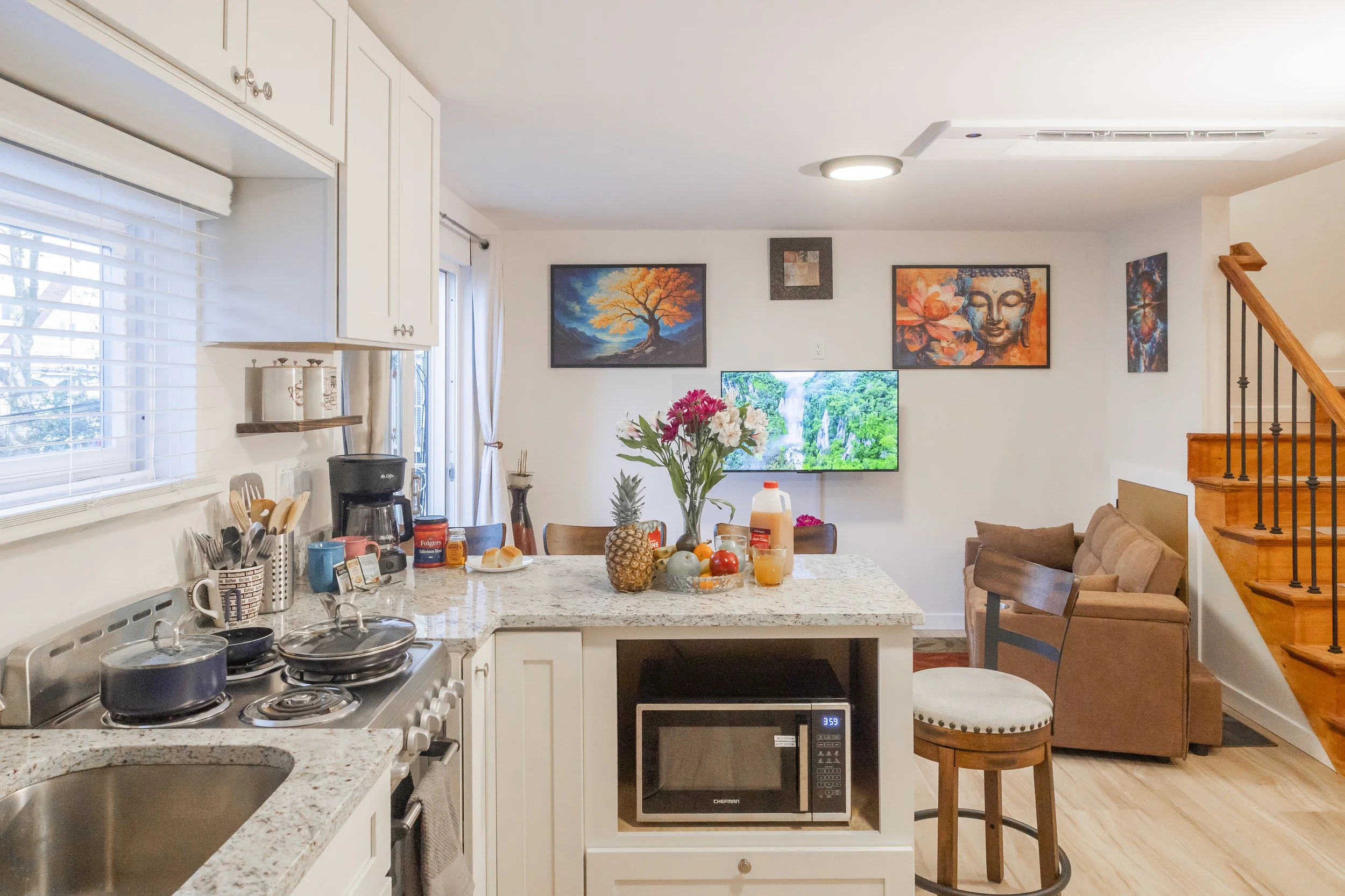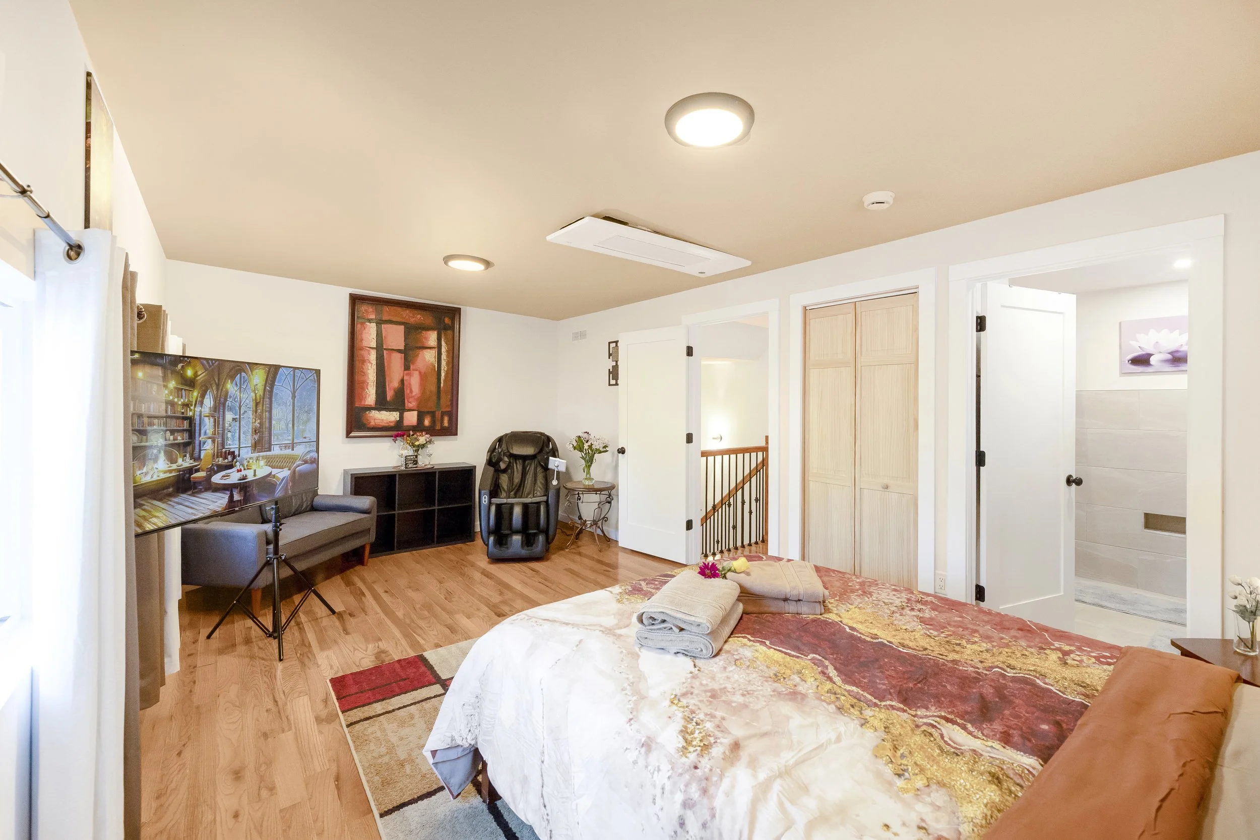 The upper level is dedicated to rest and recovery, featuring a spacious bedroom anchored by a plush queen-size bed and a professional-grade massage chair located in your bedroom suite. With a full bathroom on each level, guests enjoy total convenience and privacy. The stylish downstairs lounge area is centered around a fully stocked kitchen for those who prefer homemade meals and cozy movie nights.
