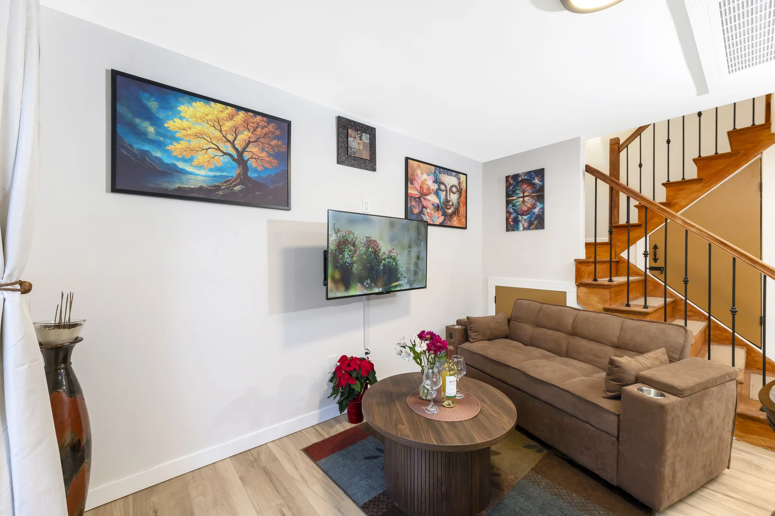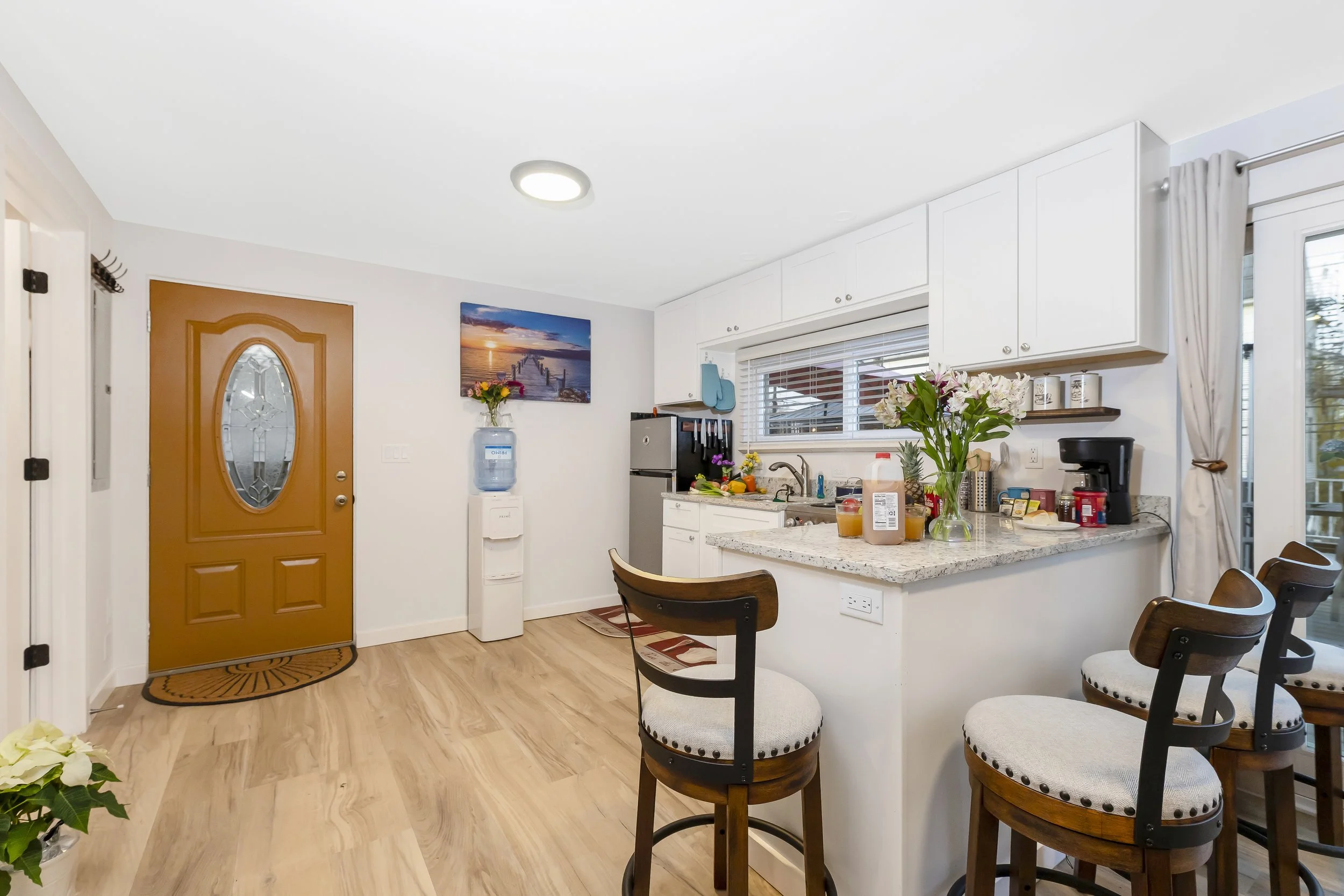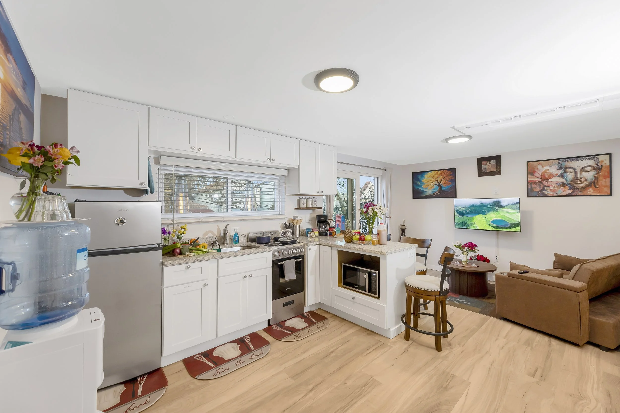 The upper level is dedicated to rest and recovery, featuring a spacious bedroom anchored by a plush queen-size bed and a professional-grade massage chair located in your bedroom suite. With a full bathroom on each level, guests enjoy total convenience and privacy. The stylish downstairs lounge area is centered around a fully stocked kitchen for those who prefer homemade meals and cozy movie nights.