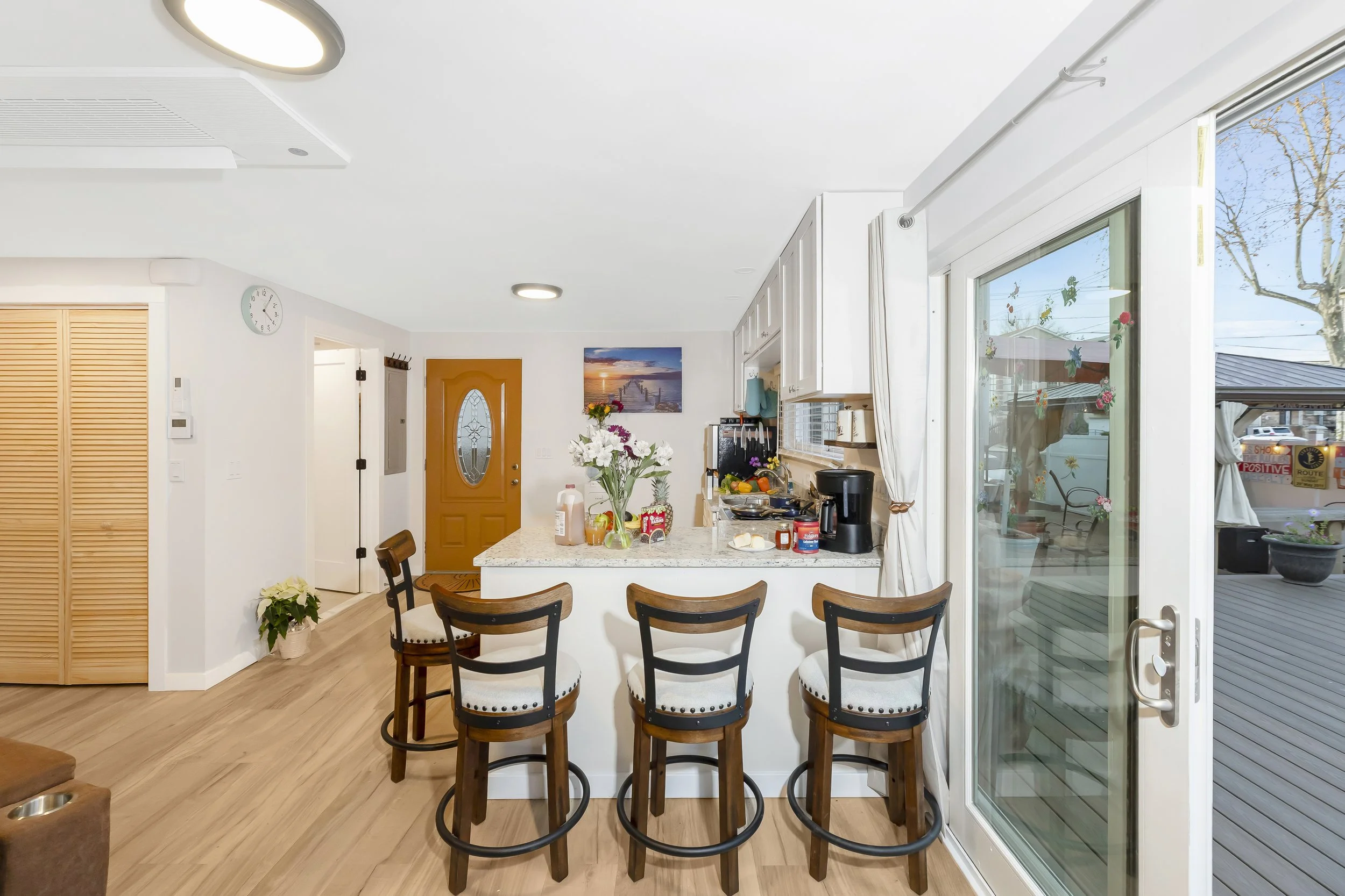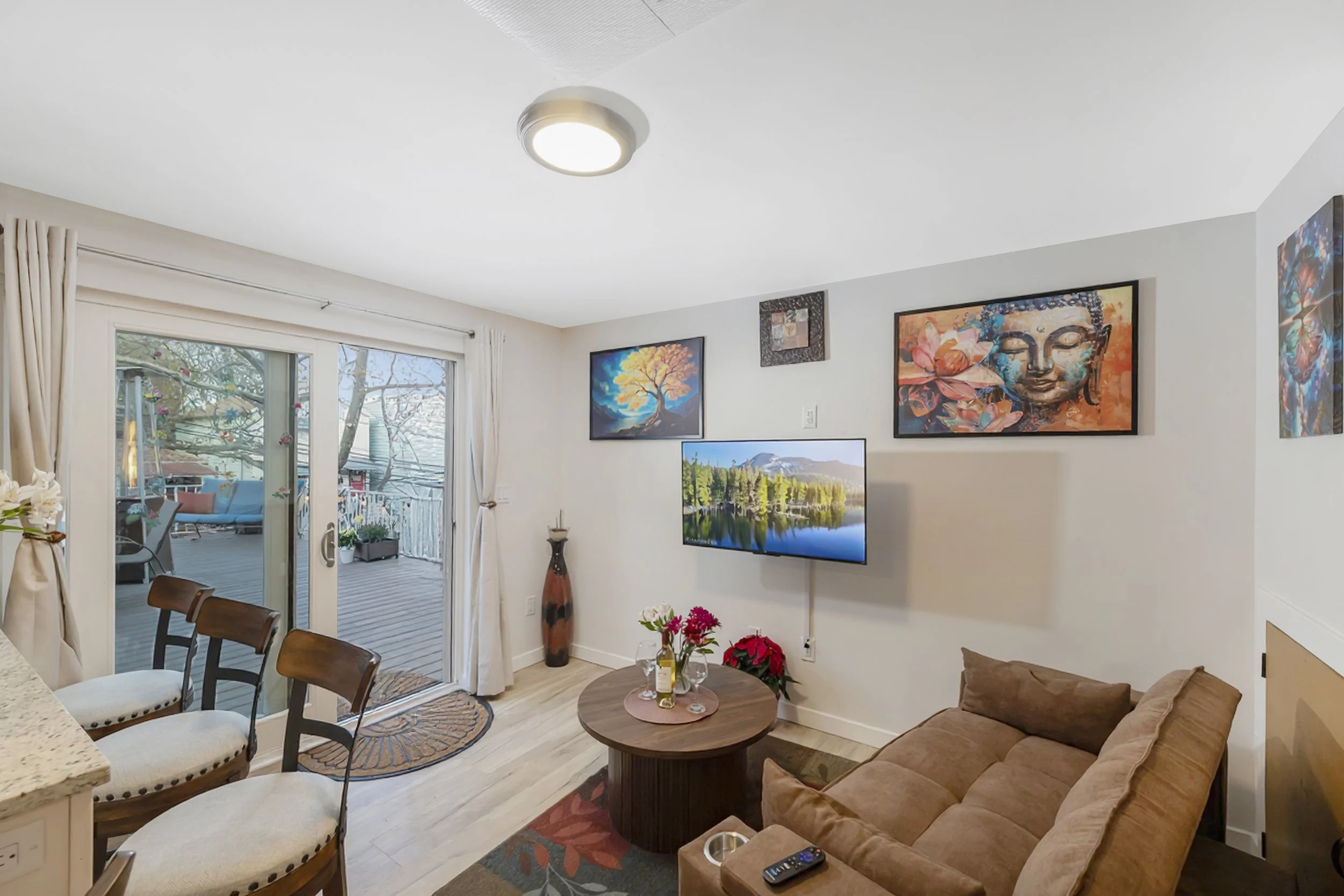 The beauty of the unit continues with its seamless connection to the outdoors. The living area opens directly onto an expansive, multi-level deck and patio designed to feel like a second living room. This massive entertainment space features: